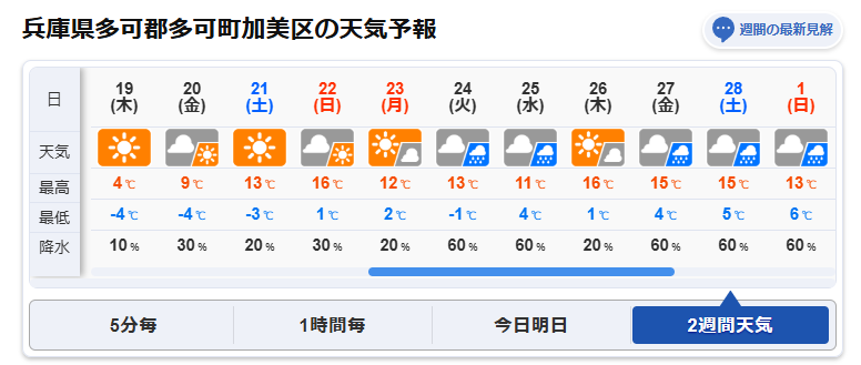 兵庫県多可町の天気予報:2026.2.19~3.1